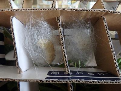 10匹中9匹が繭(まゆ)を作りましたが、残りの1匹は繭を作ることができませんでした。9個の繭は中身が見えないくらいしっかりとした厚みになっていました。