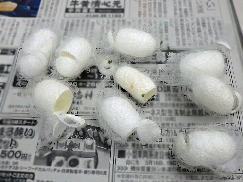 養蚕農家さんでは、腐敗やカビの発生を防ぐなどの理由で繭を冷凍・乾燥させますが、今回は省略しました。