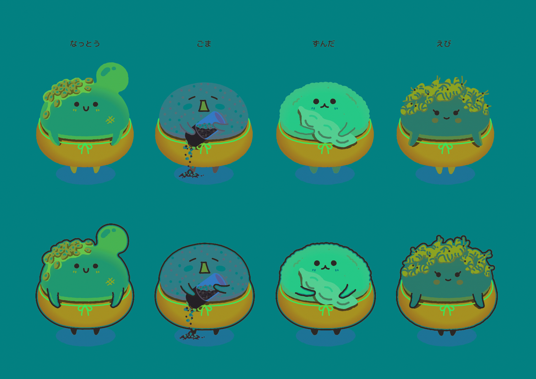 お椀をデカパンに見立ててキャラクターに盛り込み、キャラクターに統一感と愛着がわくように意識しました。