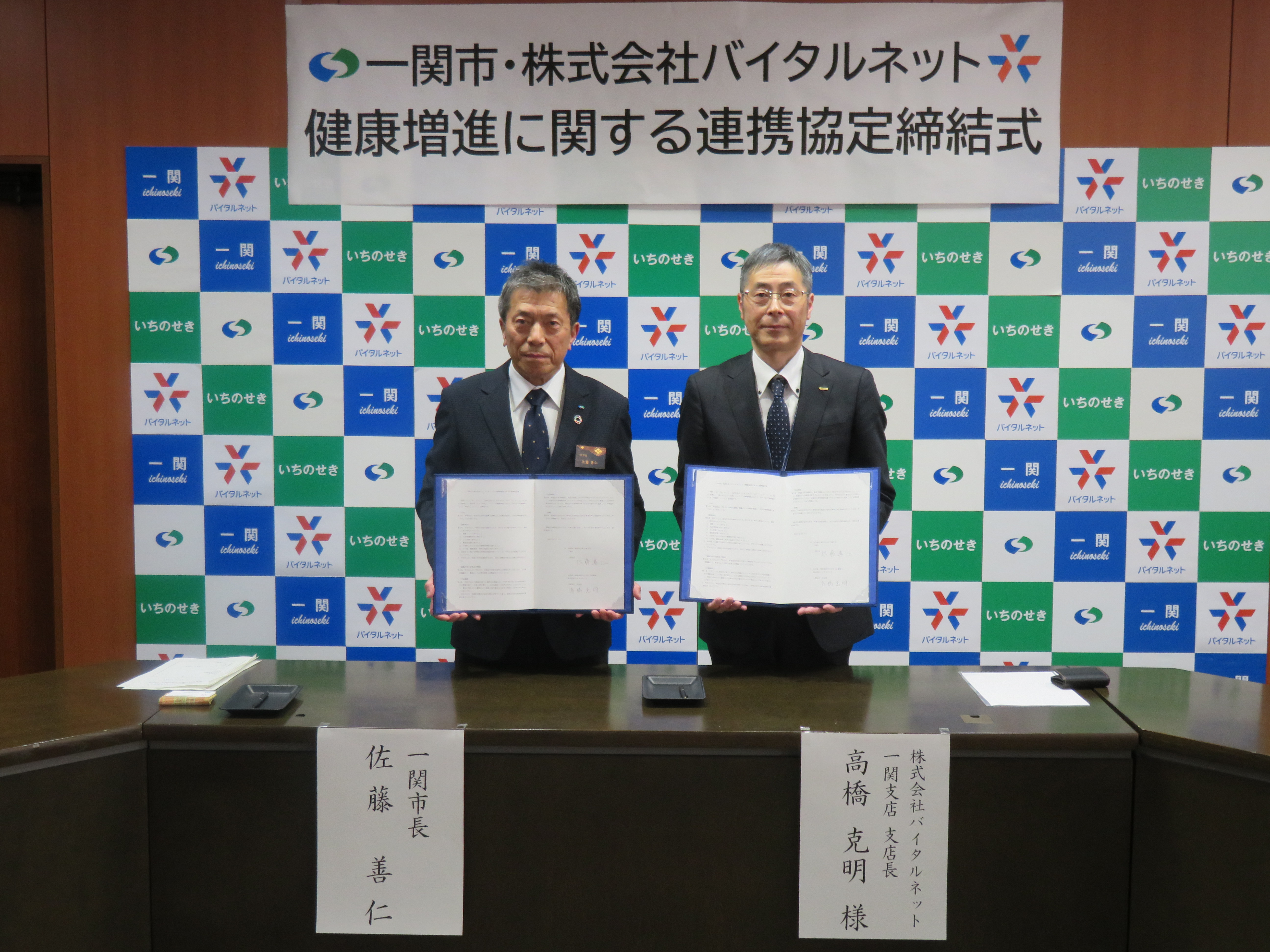 株式会社バイタルネットと健康増進に関する連携協定を締結しました コンテンツ番号:526 更新日:2025年3月7日 印刷 大きな字で印刷 一関市と株式会社バイタルネットは、相互に連携と協働による活動を推進し、市民の健康増進に資することを目的として、令和7年3月7日に、「健康増進に関する連携協定」を締結しました。「地域共生社会の実現」や「健康長寿のまちづくり」を推進するため連携しながら取り組んでいきます。 連携事項 健康づくりに関すること 生活習慣病予防に関すること がん対策に関すること 感染症対策に関すること 災害時における市民の健康保持等に関すること その他、健康増進・疾病の重症化予防に関すること このページに関するお問い合わせ 健康こども部 健康づくり課 〒021-0026 岩手県一関市山目前田13番地1 電話番号:0191-21-2160 FAX番号:0191-21-4656 メールでのお問い合わせ このページの現在位置 市政情報 市役所からのお知らせ お知らせ 前のページへ戻る ホームに戻る