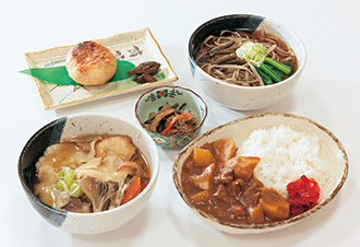 地元のお母さんたちが切り盛りする山あい工房では、地元産の食材を使った「山カレー」や「山菜はっと」「そばきり」「味噌田楽」など郷土料理を提供しています。