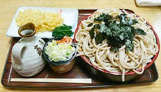 一関地域を流れる磐井川の側にあり、平日や休日を問わずお昼時は駐車場がすぐに満車になるほど行列ができます。来客のお目当ては、天もり(天ざるそば)です。このおそばの特徴は、驚くほどの長さ、太さ、そして量です。想像以上の長さなので、箸で切って食べることをお勧めします。太さも一般的なそばの倍以上あるであろう太さをしています。量もまた然り、非常に食べ応えのある逸品です。天ぷらも一つ一つがとても大きく、こちらもボリューム満点です。