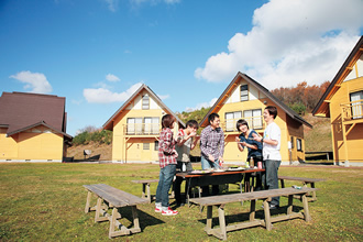室根山の大東町側に位置し、目の前に広がる雄大な室根高原のロケーションが自慢のコテージ型宿泊施設。外ではBBQセットも完備しており、気軽にアウトドアグルメを味わう事ができます。近くにはテニスコートもある施設もあり、サークル活動や合宿にも最適です。いい汗をかいた後は ゆっくりと大浴場でリフレッシュ!室根高原を一望できる大浴場では、夕日を眺めながら、のんびりゆっくり入浴するのがおすすめ。