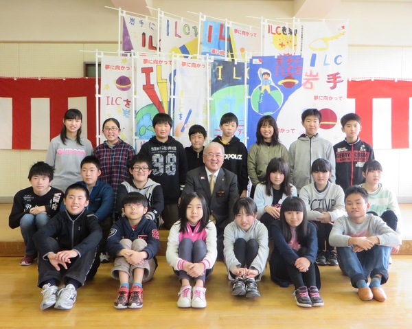 一関市千厩町の奥玉小学校6年生22名が3月5日、卒業制作したILC実現を願うのぼり旗を披露しました。