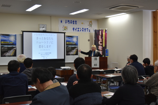 市主催の「いちのせきサイエンスカフェ」は1月27 日、東山地域交流センターを会場に開催し、31人が参 加しました。高エネルギー加速器研究機構(KEK)素 粒子原子核研究所准教授多田将氏が「ニュートリノ」 をテーマに講演し、参加者と意見交換を行いました。