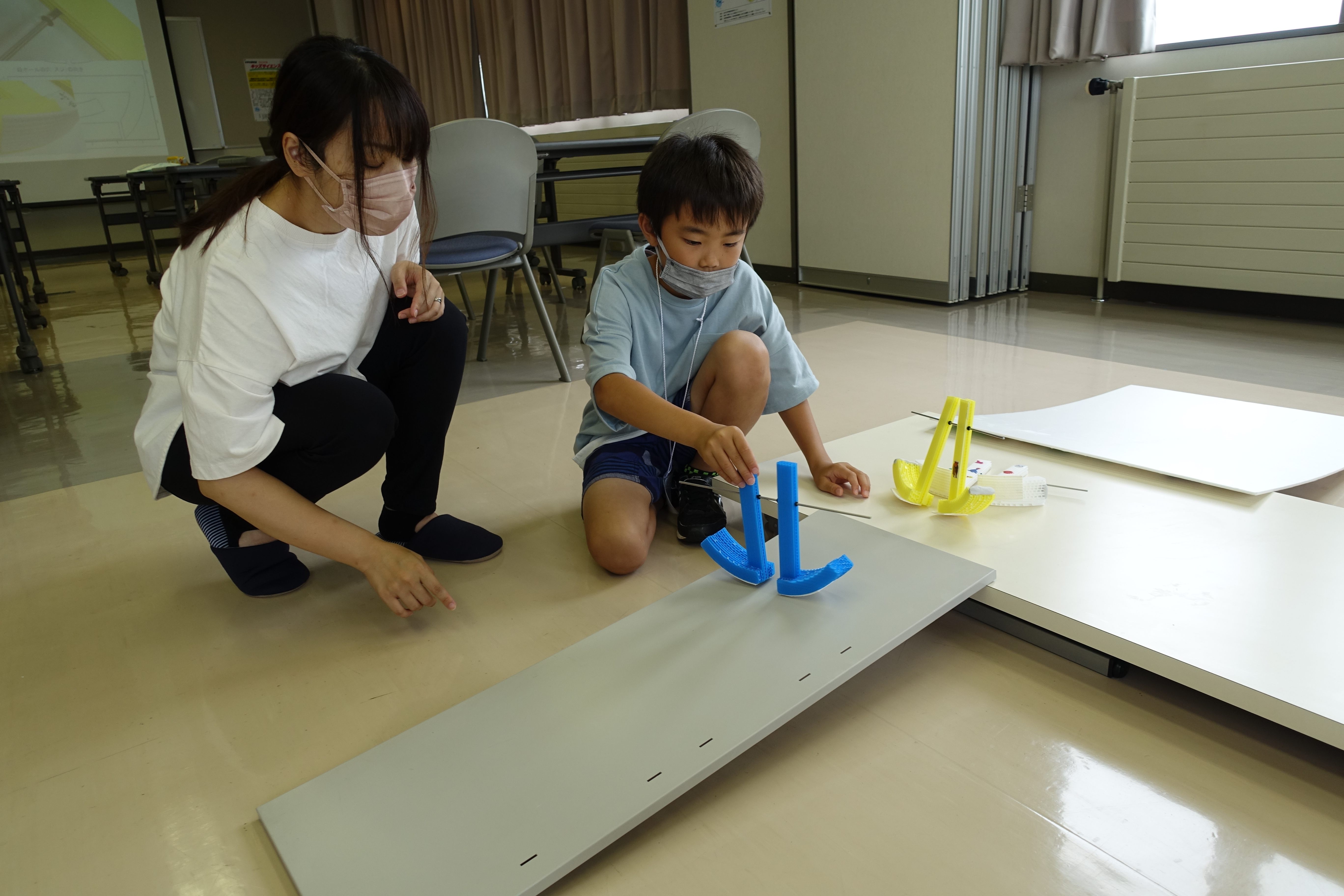 子どもたちは、製作したロボットの重心や歩行幅などを工夫しながら、安定した二足歩行を目指して繰り返し挑戦していました。