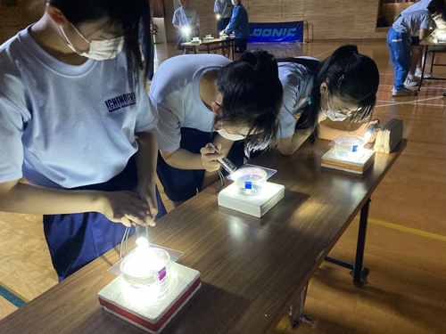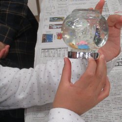 二酸化炭素を使った実験や炎色反応等を体験し、工作では都市鉱山の金箔を使った「スノードーム」を作りました。