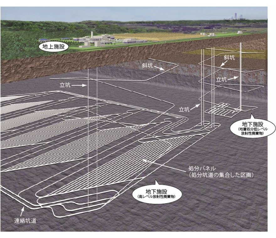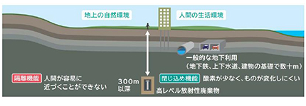 「特定放射性廃棄物の最終処分に関する法律」では、原子力発電で発生する使用済核燃料に起因する高レベル放射性廃棄物の最終処分は地下300メートルよりも深い地層に埋設処分(地層処分といいます