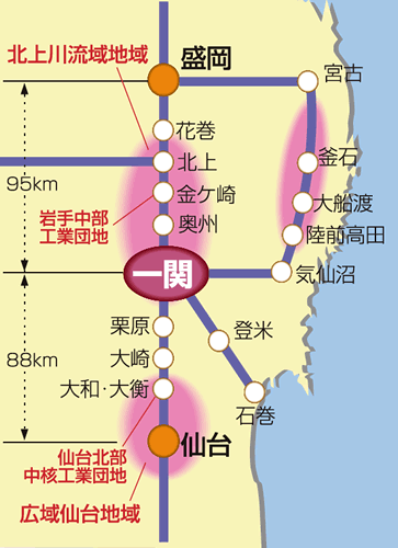 企業の大型立地が進む東北地方の中で、新たな産業戦略の拠点として注目されています。「一関」は福島から青森までの東北エリアをカバーできる絶好の位置にあります。
