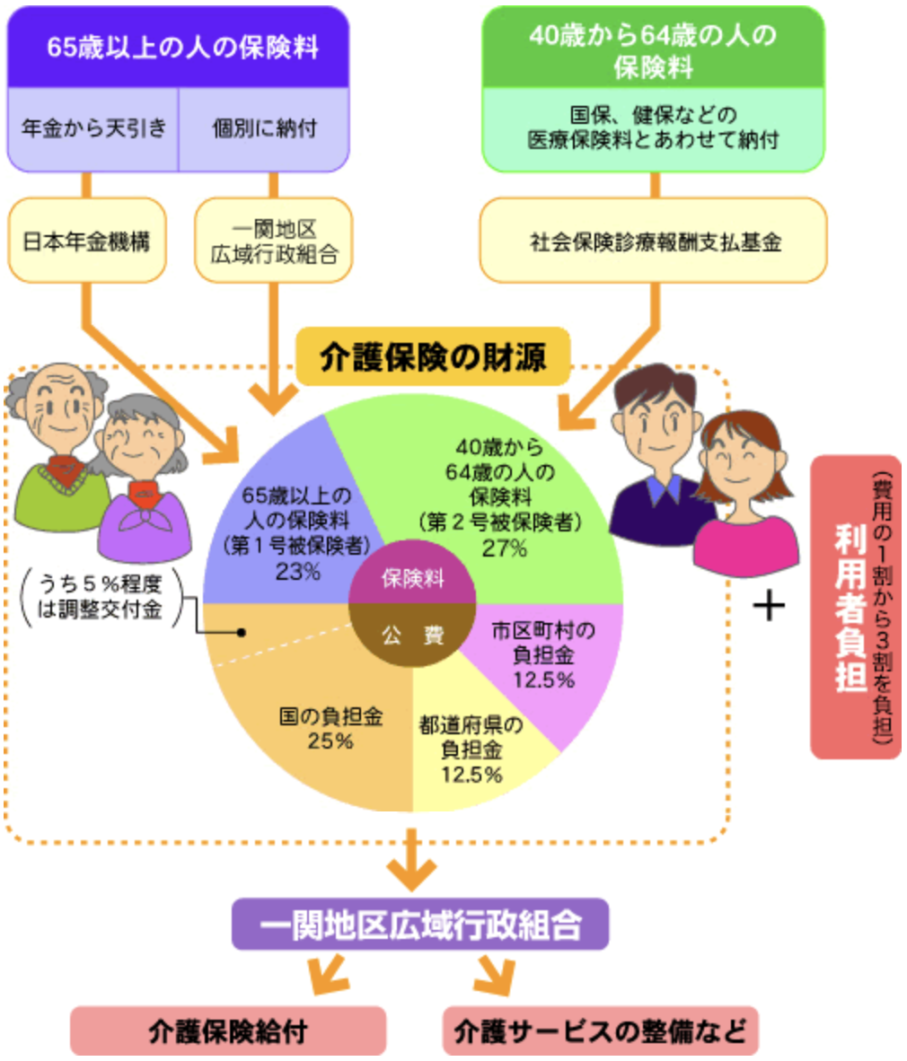 介護保険の財源は、国や自治体の負担金と、40歳以上の人が納める保険料でまかなわれています。これらは、みなさんが受ける介護サービス費用の保険給付分や、介護サービスの整備など介護保険事業にかかる費用にあてられます。