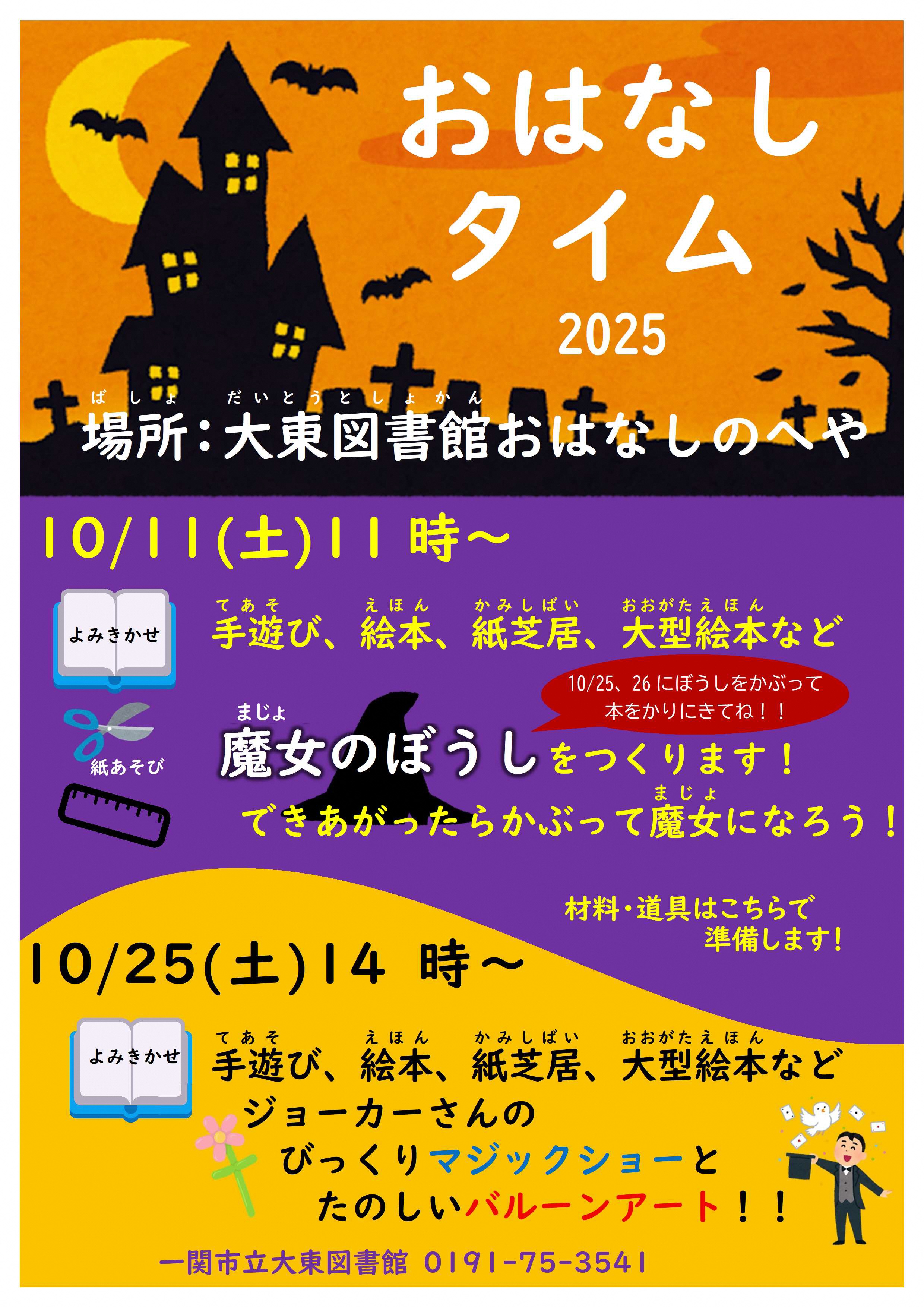| 10月25日 | おはなしタイム&マジックショー・バルーンアート | 14時から 1階おはなしのへや | 図書館職員による絵本などの読み聞かせと、「マジックサークル・ジョーカー」さんによるマジックショー・バルーンアート |