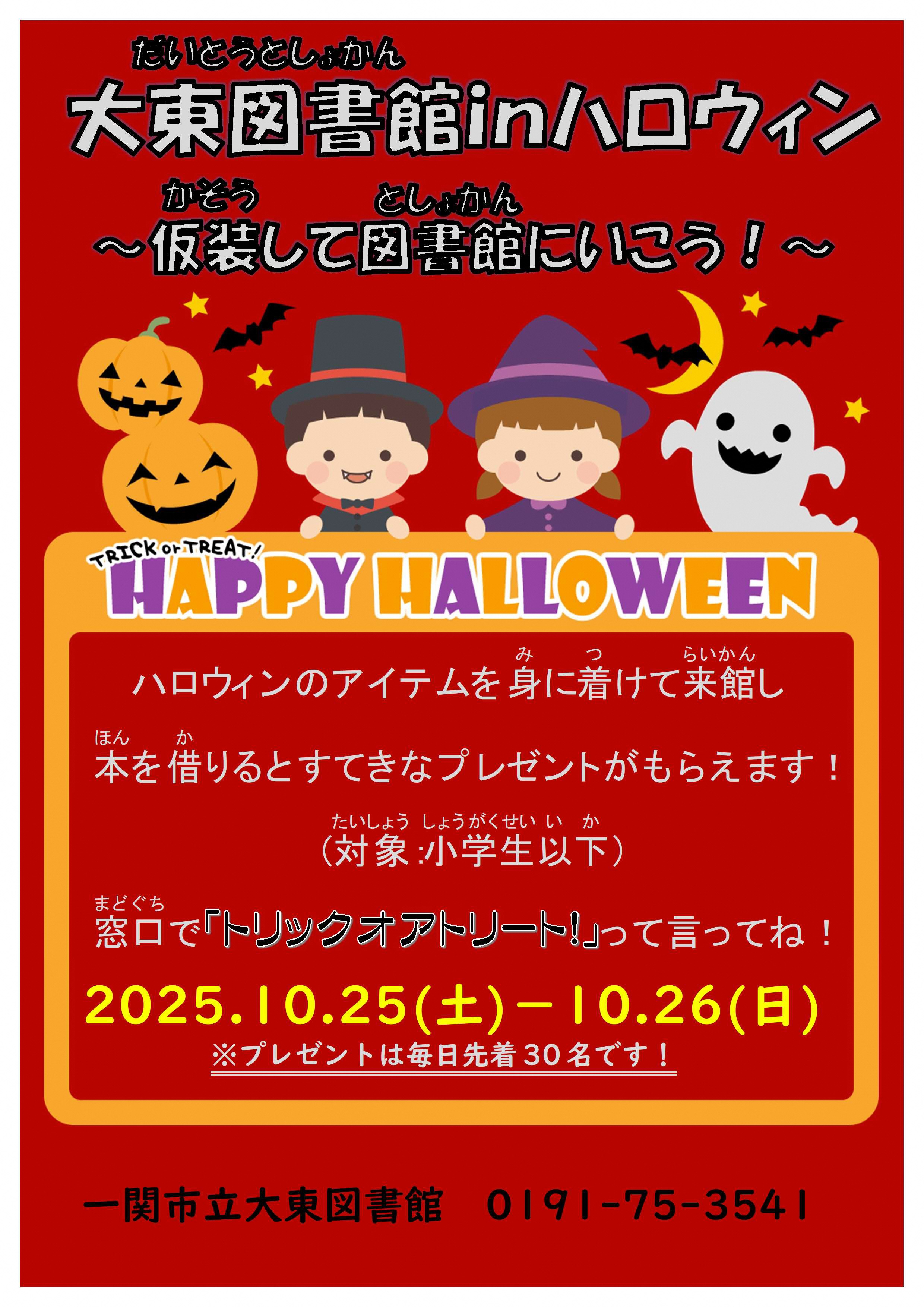 | 10月25日 | 大東図書館㏌ハロウィン | カウンター | ハロウィンのアイテムを身に着けて来館し、本を借りるとすてきなプレゼントがもらえます。 ※先着30名 ◆対象:小学生以下 |