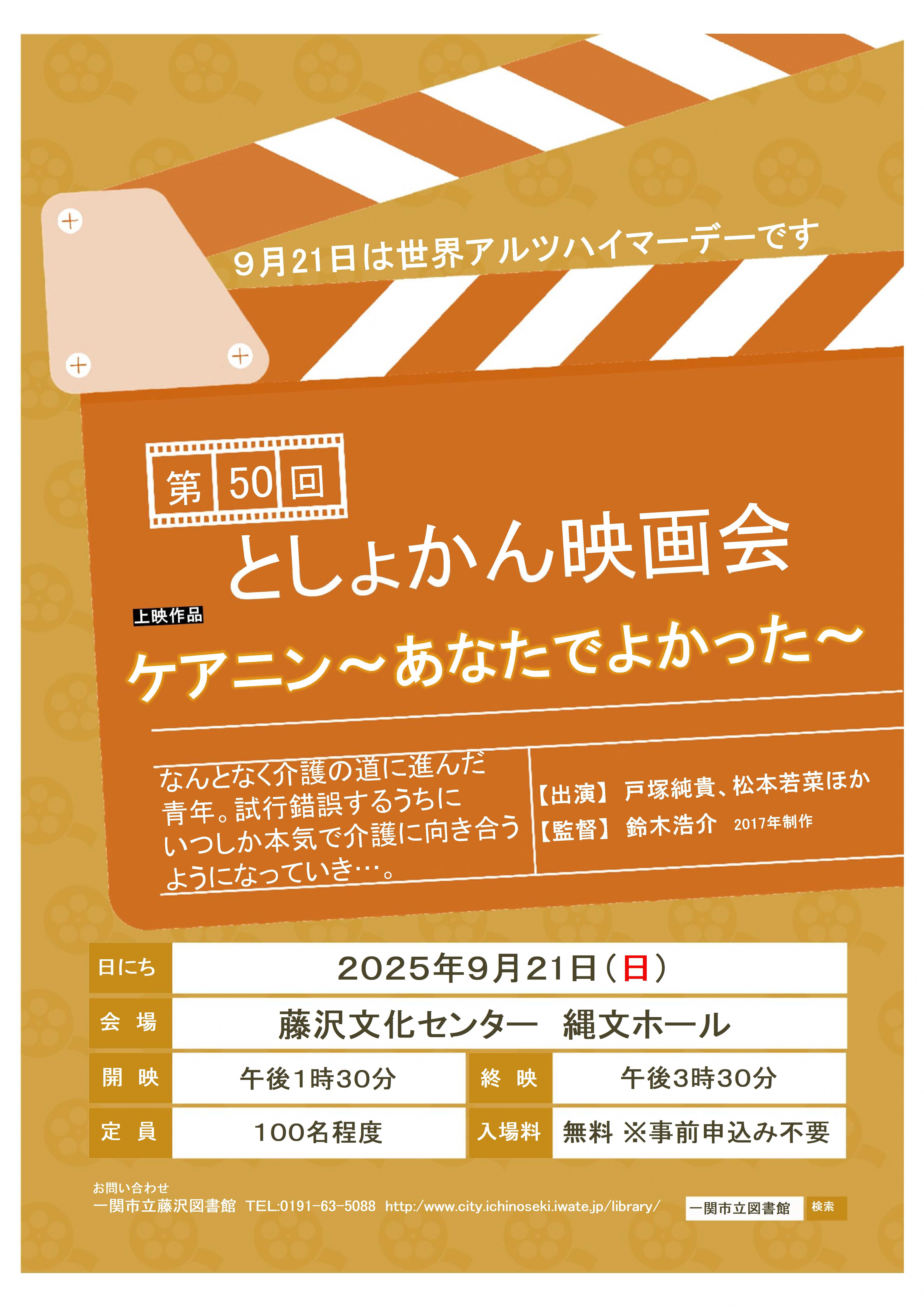 中学生以上を対象とした映画の上映会 内容「ケアニン~あなたでよかった~」 出演:戸塚純貴、松本若菜ほか 費用:無料 ※事前申込み不要 どうぞお気軽にご参加ください。 |