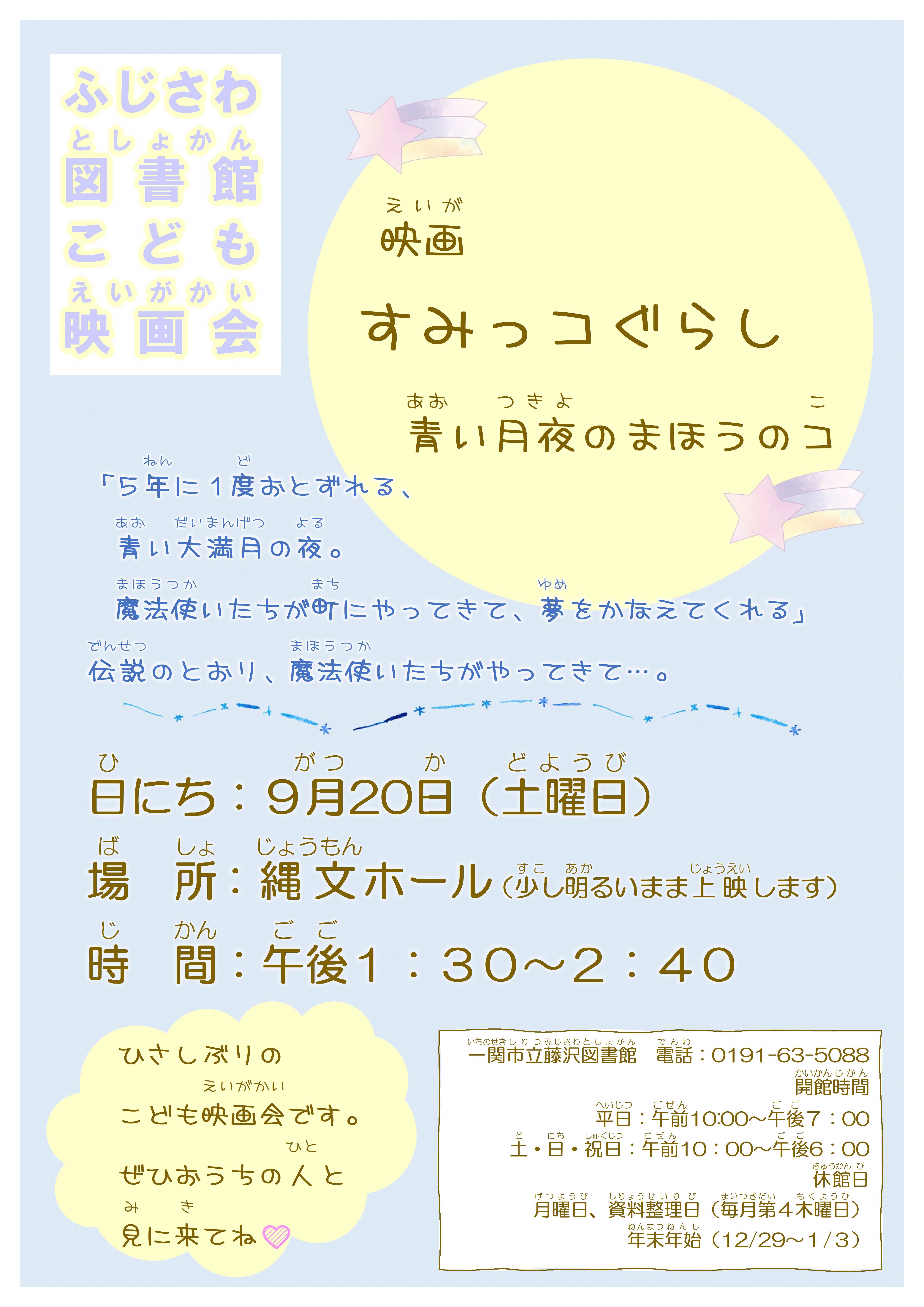 主に小学生以下を対象とした映画の上映会 内容「すみっコぐらし~青い月夜のまほうのコ~」 費用:無料 ※事前申込み不要 どうぞお気軽にご参加ください。 |