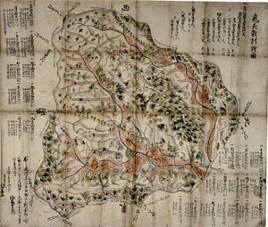 現在の一関市と南町・千代田町・台町と真柴の一部にあたる、旧一関藩領鬼死骸村の絵図です。