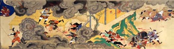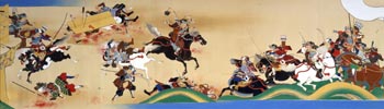 後三年合戦(ごさんねんかっせん)は、永保3年(1083)から寛治元年(1087)にかけて起こった陸奥の戦乱です。安倍氏が滅亡した前九年合戦(ぜんくねんかっせん)によって奥羽の大豪族となった清原氏でしたが、二十余年を経過して内紛が始まりました。さらに新しく陸奥(むつ)の国守として赴任した源義家(みなもとのよしいえ)が、この内紛に介入したことから戦火が拡大していきました。やがて、清原氏が滅んで戦いが終わり、朝廷から私闘とされた義家も都へ去って、最終的に勝利者となったのは、安倍氏の血を引き清原氏のもとで成長した藤原清衡(ふじわらのきよひら)ただ一人でした。彼はその後、平泉黄金文化を華開かせていくことになります。
