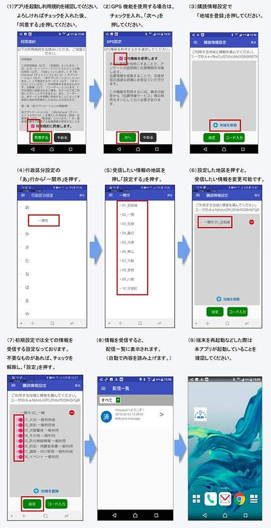 - アプリで受信した情報を複製頒布、出版、放送等への二次利用、再配布は禁止いたします。このサービスは災害に関する発生情報の配信のみで、経過等は配信しません。また、災害の詳細な内容についての問合せには対応できかねますので、あらかじめご了承下さい。