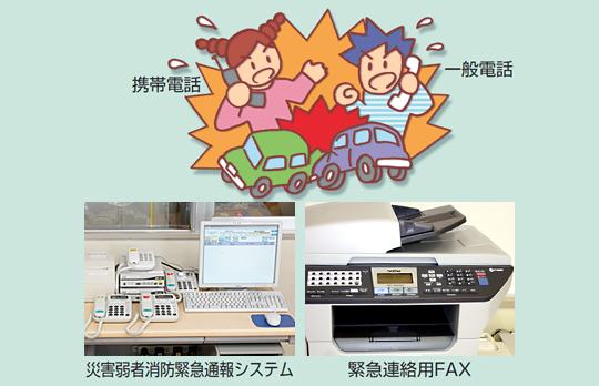 市町・消防団・警察・病院・電力会社・NTTなど、災害による被害を最小限にするため関係する機関へ連絡します。