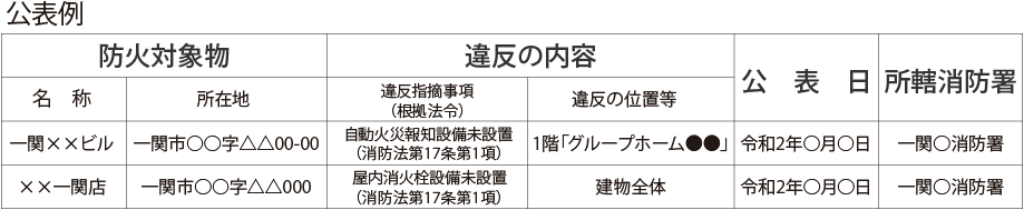 建物を利用される皆様の安心・安全のため、一関市火災予防条例第47条の2に基づき、重大な消防法令違反のある防火対象物を一関市消防本部のホームページで公表します。